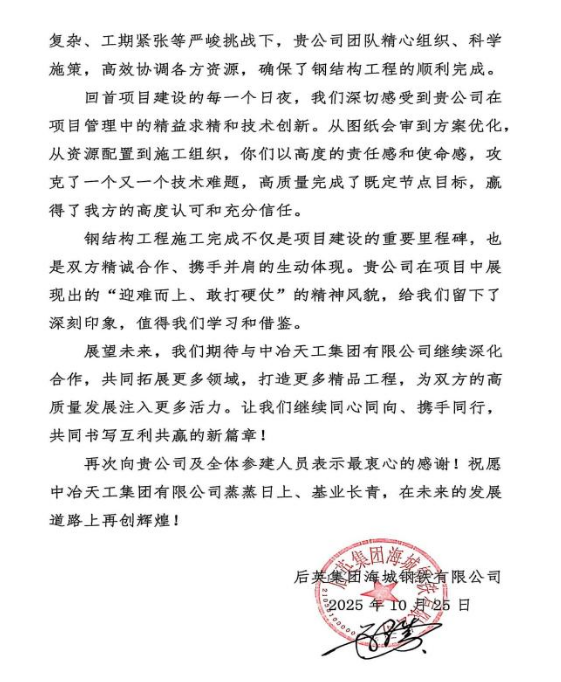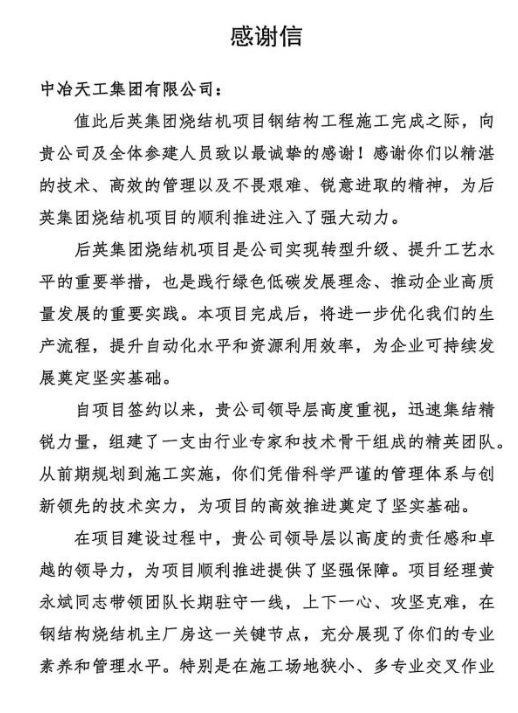 近日,工業工程公司后英集團燒結機項目收到來自業主的感謝信,信中對公司在該項目鋼結構工程施工中的杰出表現給予高度評價。