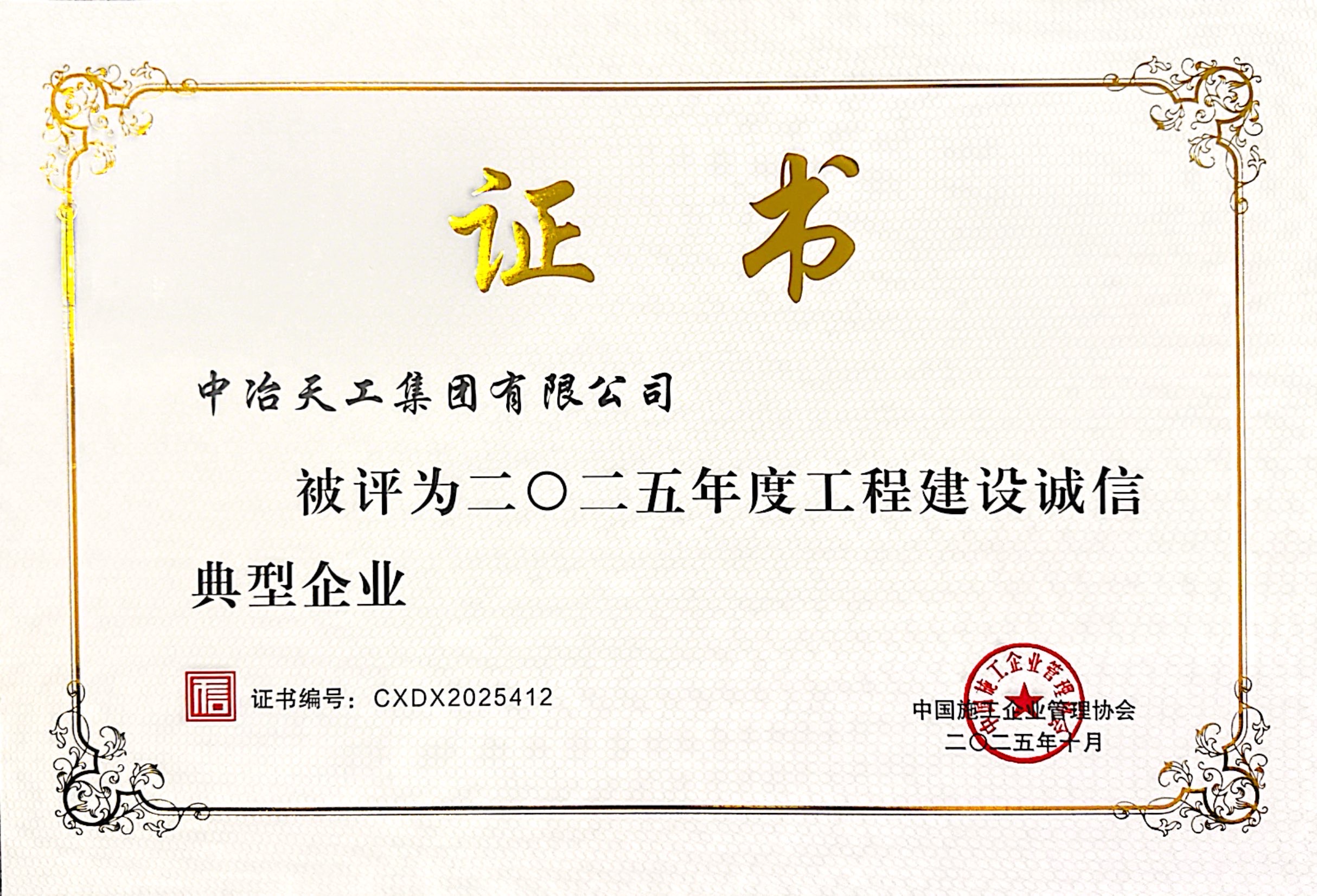 中国施工企业管理协会20242025年度全国工程建设诚信典型企业(中冶天工)