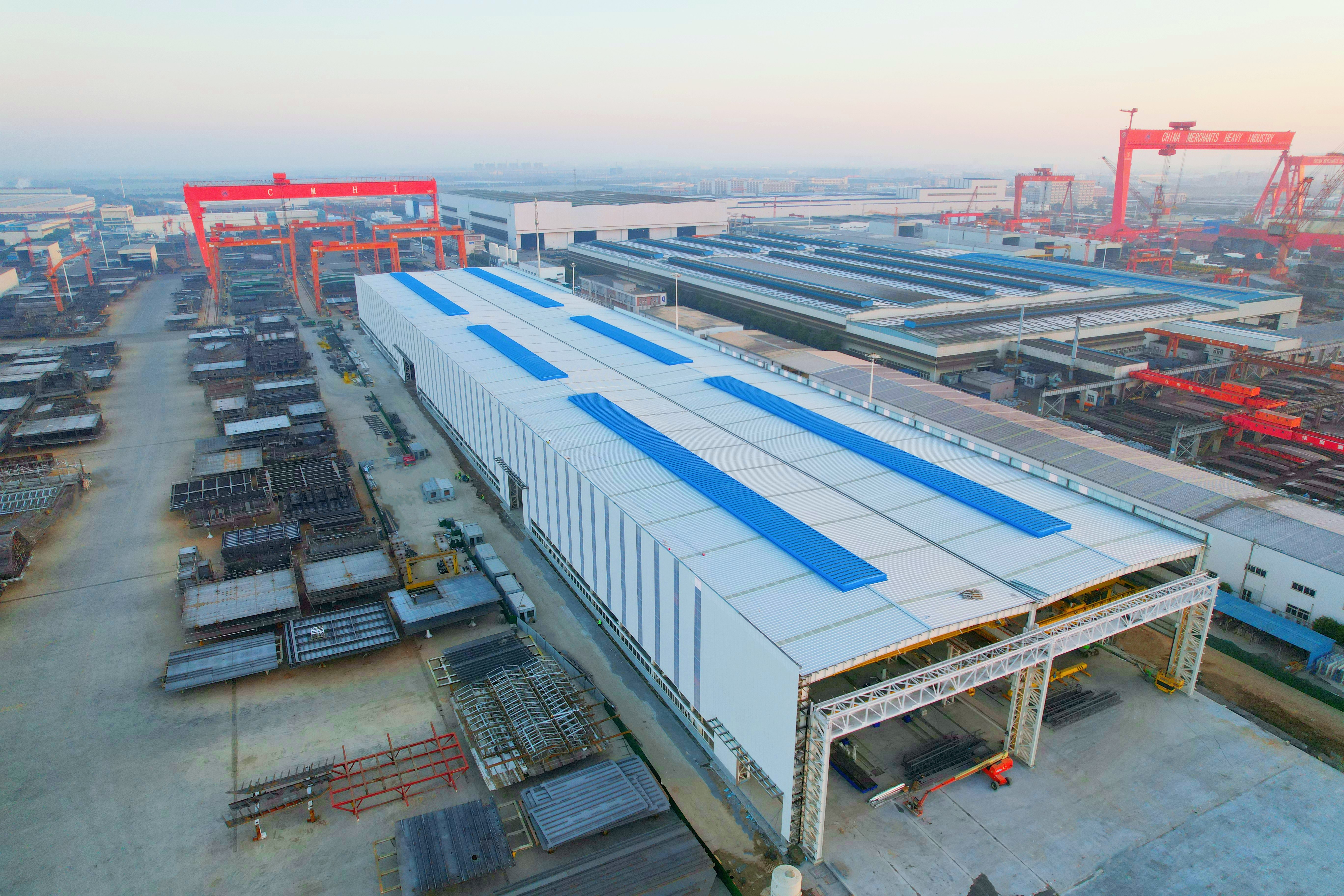 該項目位于江蘇省南通市海門區招商局郵輪制造有限公司廠區內,為單層鋼結構廠房。軸線總長348.5米,軸線總寬66.35米,建筑最大高度為28.05米,鋼結構工程共計4600噸。作為招商船舶工業集團2024年重點工程,項目集創新設計、先進工藝與品質建造于一體,建成后將為船舶工業實現車間級智能化生產提供全新解決方案,有力支撐高端船舶制造提質升級。