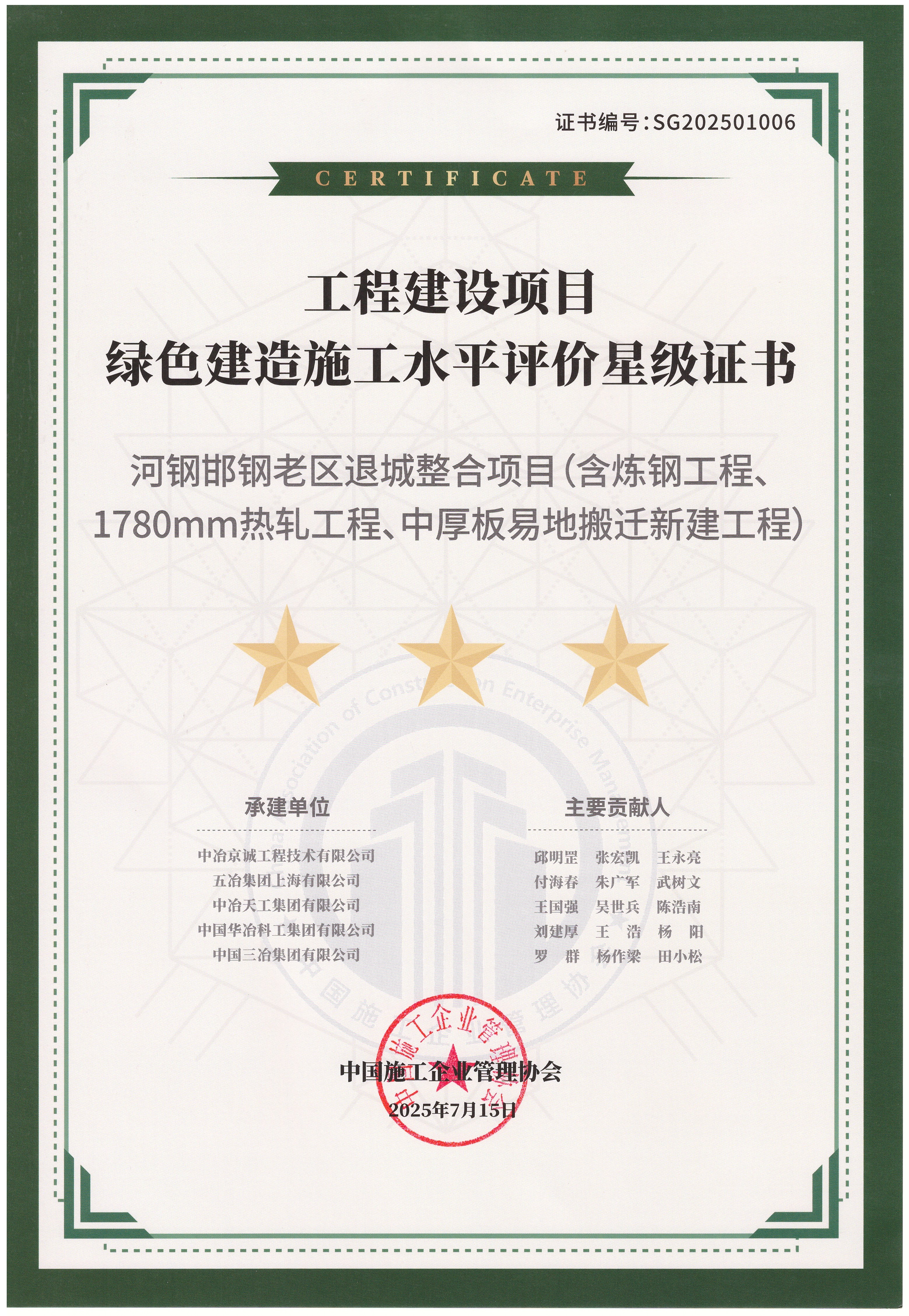 日前,由工業(yè)工程公司承建的河北省邯鄲市河鋼邯鋼老區(qū)退城整合項(xiàng)目榮獲中國(guó)施工企業(yè)管理協(xié)會(huì)頒發(fā)的2025年度綠色建造施工水平評(píng)價(jià)三星級(jí)證書,該等級(jí)是綠色建造施工領(lǐng)域的最高評(píng)價(jià),充分彰顯了中冶天工在綠色建造領(lǐng)域的技術(shù)實(shí)力與管理水平。