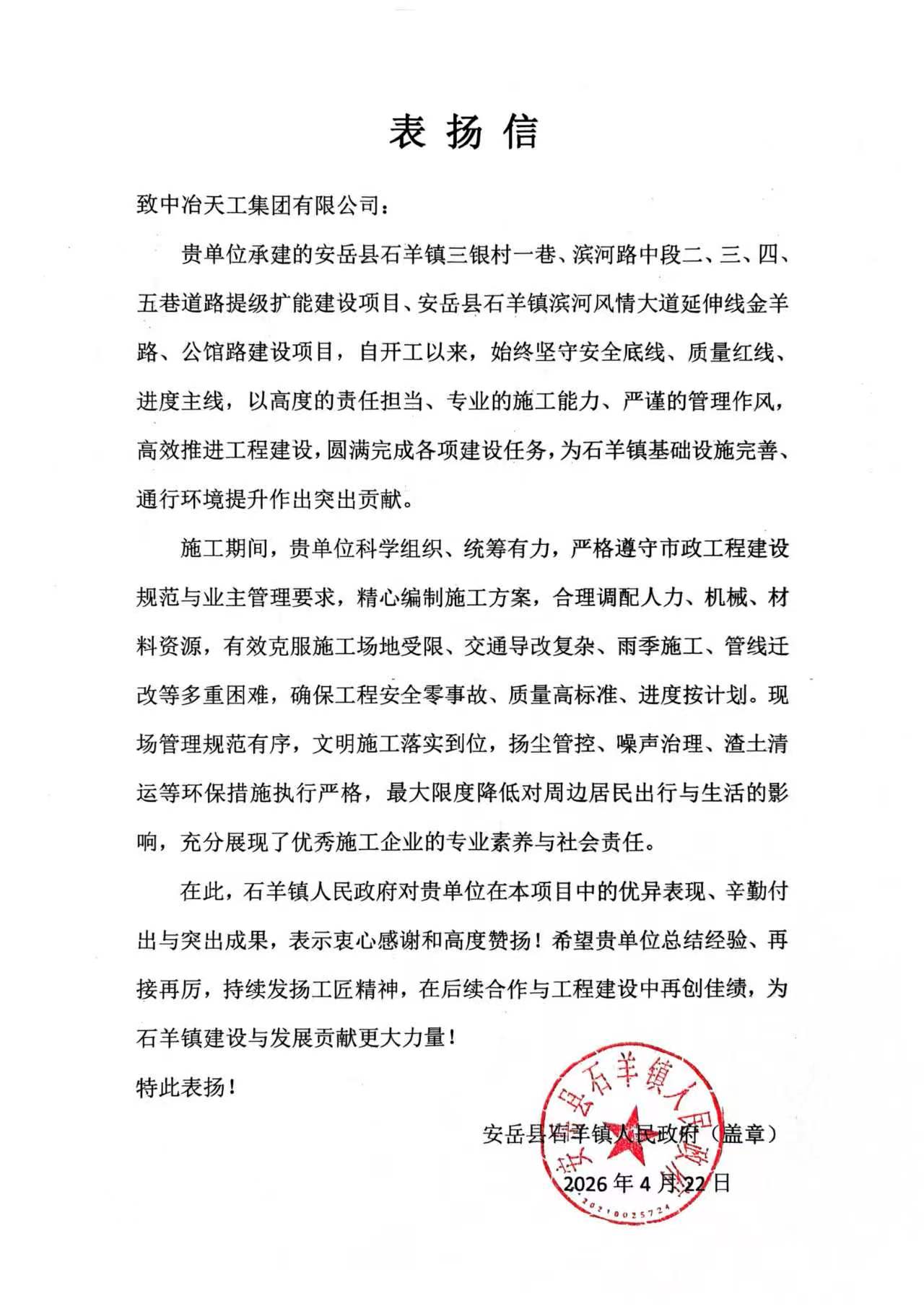 4月22日,城建公司安岳縣石羊鎮建設項目收到安岳縣石羊鎮人民政府表揚信。信中對項目團隊在該項目中的優異表現、辛勤付出與突出成果,表示衷心感謝和高度贊揚!