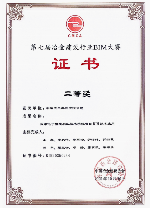 近日,華南公司承建的天津電子信息職業技術學院產教融合實訓基地項目,憑借出色的BIM技術應用成果,榮獲中國冶金建設協會第七屆冶金建設行業BIM大賽二等獎。
