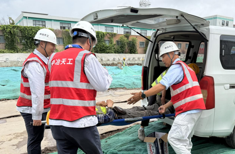 此次演練模擬場景為突降暴雨導致基坑積水迅速上漲,4名施工人員被困坑底。險情發(fā)生后,項目部第一時間啟動應急預案,各參演小組迅速響應,按照預定職責分工展開搶險行動。警戒疏散組有序組織施工人員撤離至安全區(qū)域,并設立警戒線;技術保障組迅速確認防洪點,定位救援通道;搶險救援組攜帶救援設備趕赴事故現(xiàn)場,及時有效開展各項救援工作;醫(yī)療保障組兵分兩路,一路奔赴現(xiàn)場確認傷員情況,一路在臨時醫(yī)療點隨時待命;通訊聯(lián)絡組與屬地附近的派出所、醫(yī)院單位進行聯(lián)系,為受傷人員暢通“生命通道”。通過各參演小組的緊密協(xié)作,險情得到有效控制,演練達到了預期效果。