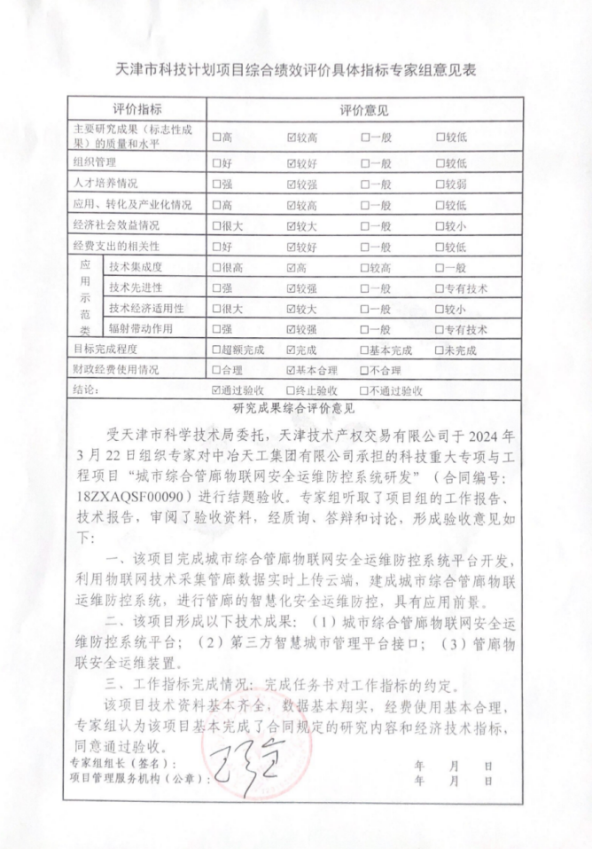 近日,由中冶天工承擔的天津市科技計劃項目《城市綜合管廊物聯網安全運維防控系統研發》通過結項驗收。該項目歷經數年艱苦攻關,系統地解決了基于物聯網技術的地下綜合管廊及管線在運行使用過程中的風險評估和安全監管問題,并取得了一系列重要的科研成果,為推動管廊運維技術領域的進步和產業發展作出了重大貢獻。